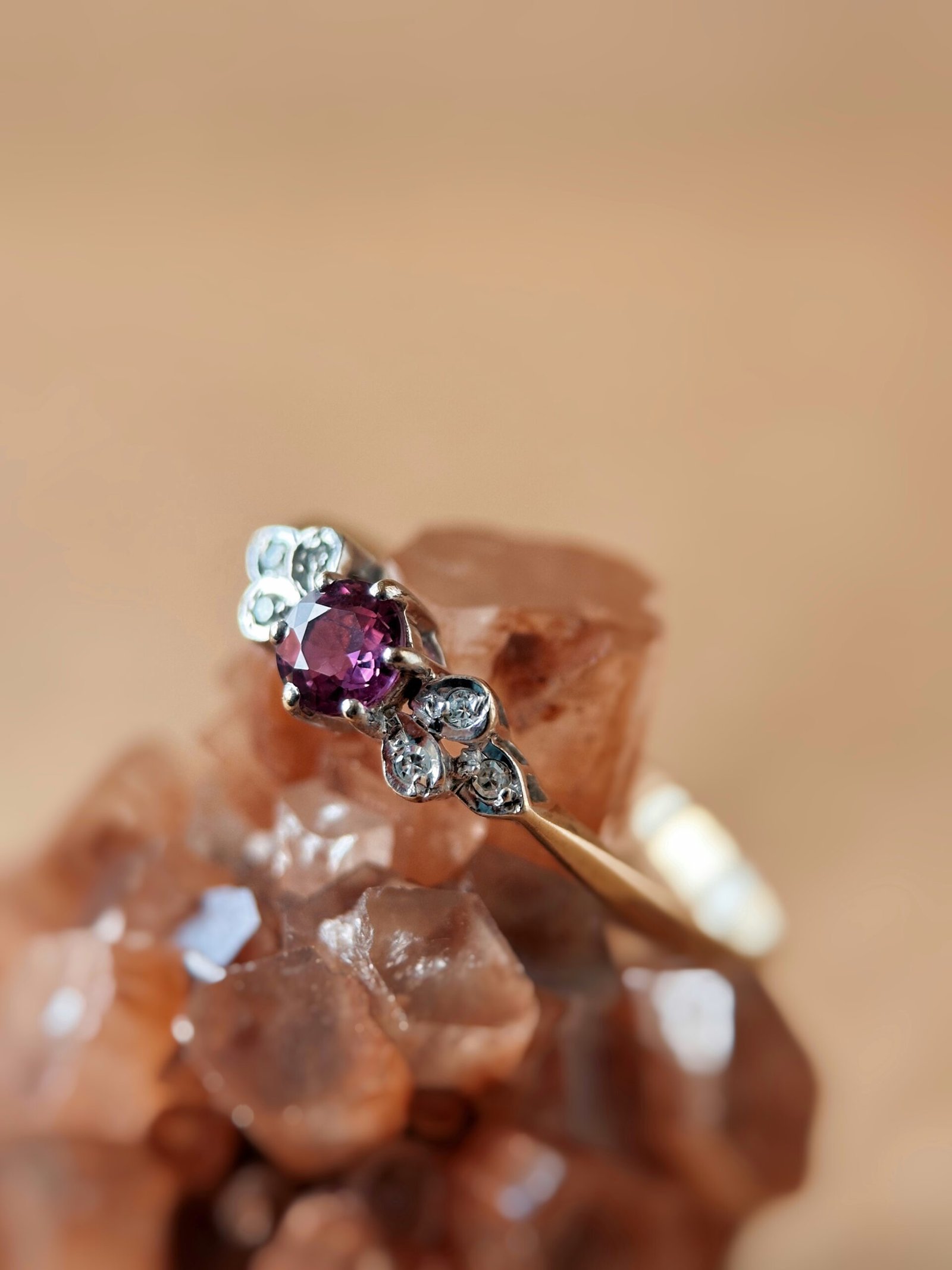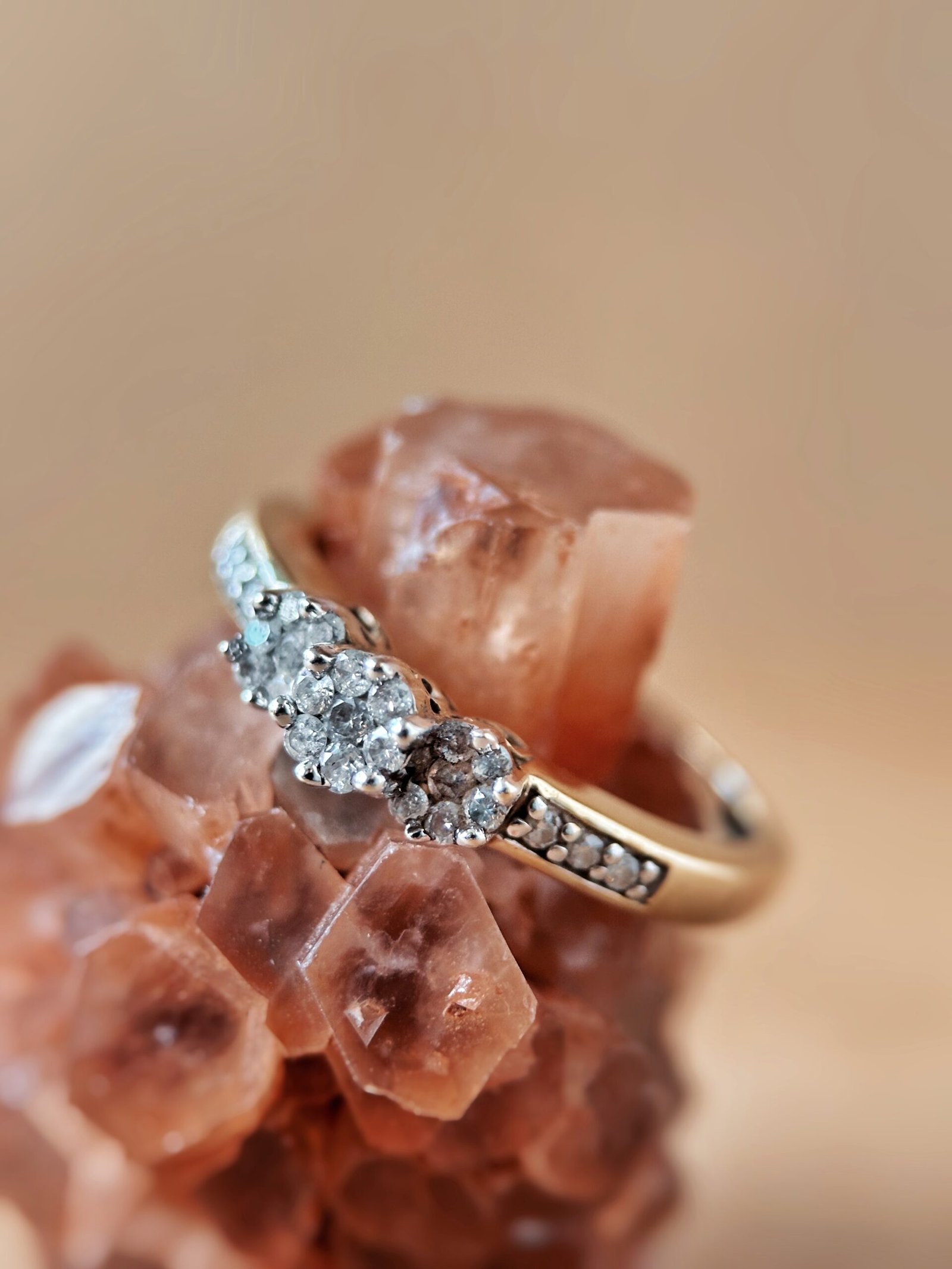 Vintage 9 carat solid gold ring with 21 flat cut 0.25 ct diamonds as centre stones and 6 diamonds on the shoulders. Hallmarked in Birmingham.