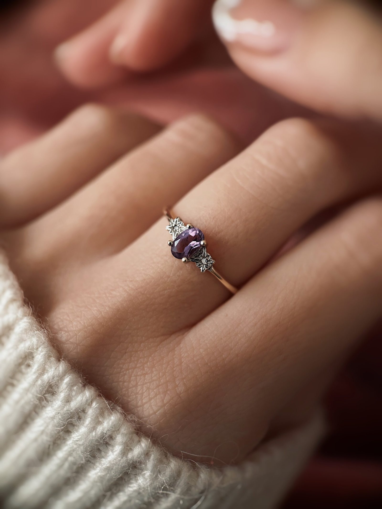 Vintage 9 carat solid gold threestone ring with one oval cut amethyst and two 0,01 ct diamonds in white gold. Hallmarked in London.