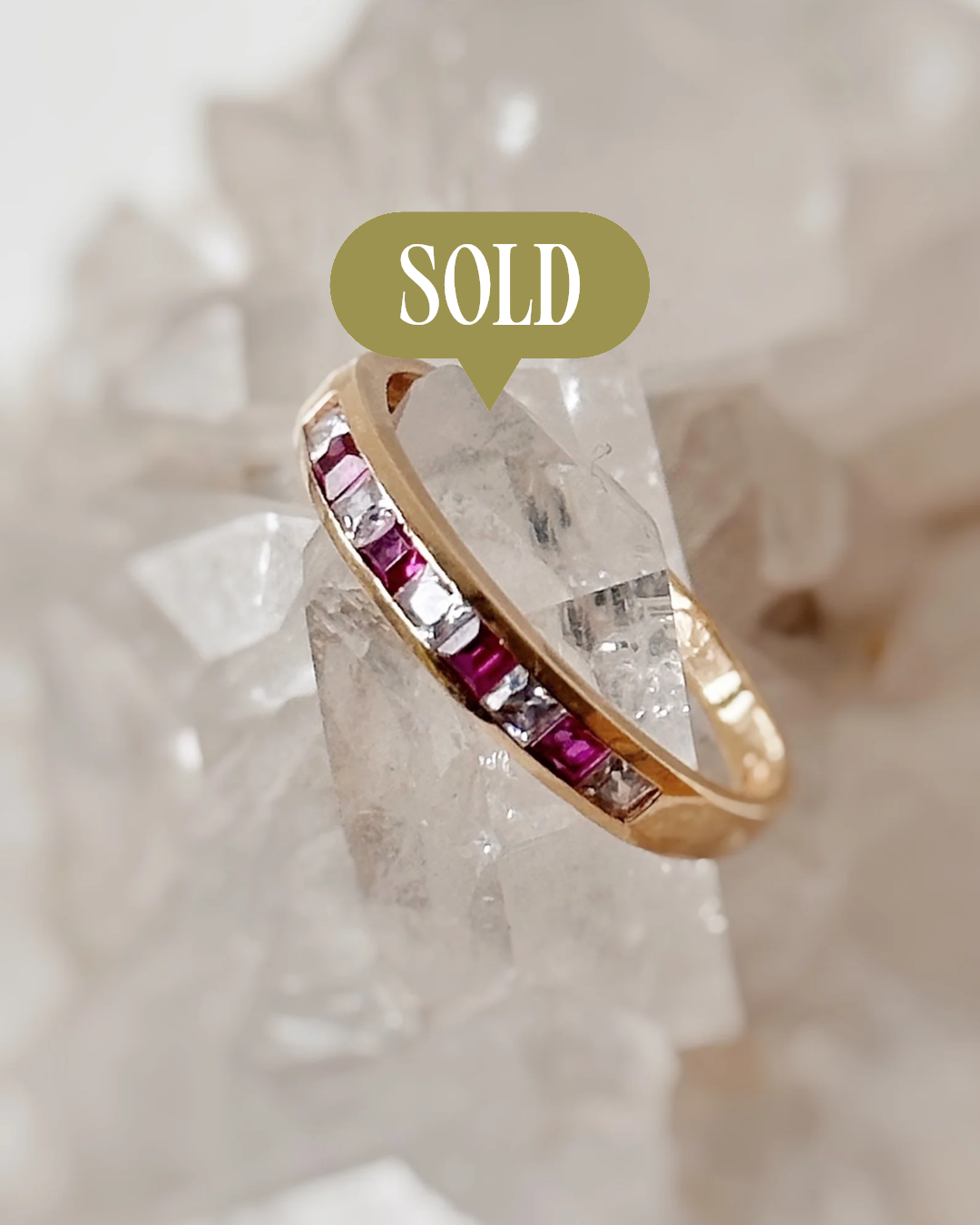 Vintage 18 carat solid gold half eternity ring with rubies and diamonds.