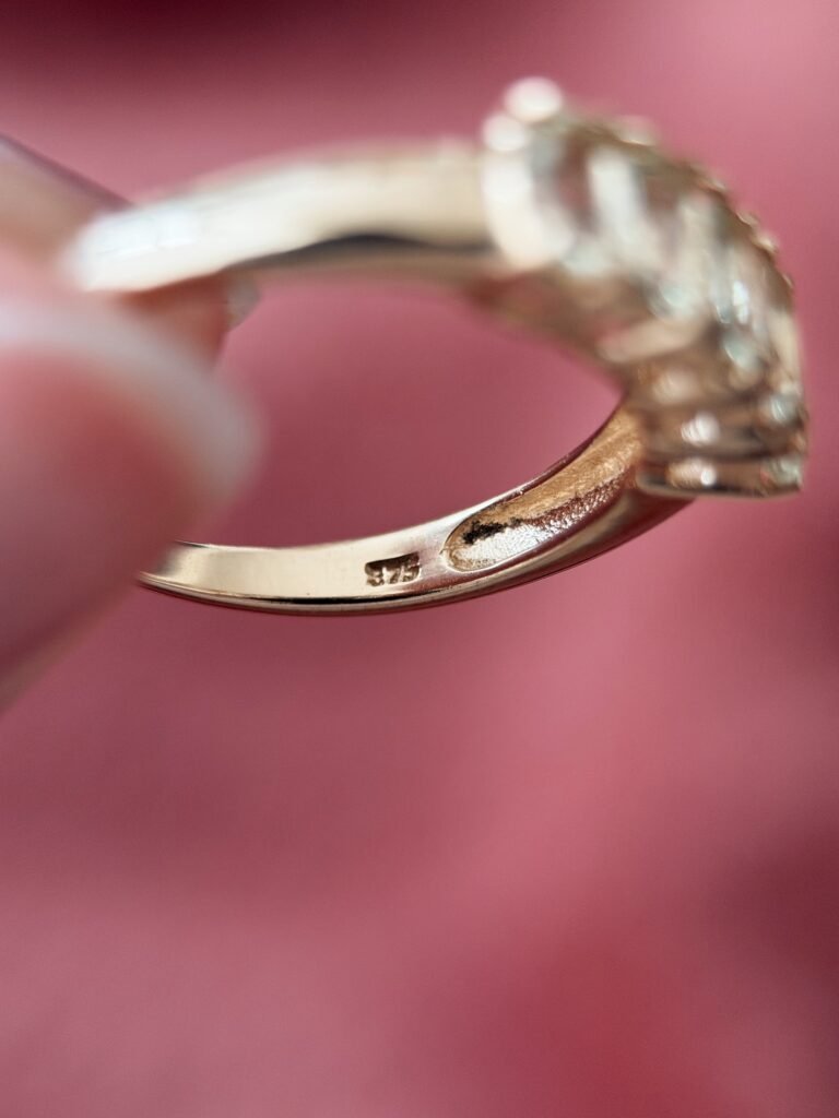 Vintage 9 carat solid gold fivestone ring with oval cut gold quartz. Marked for 9ct gold, stamped with the Birmingham anchor hallmark.