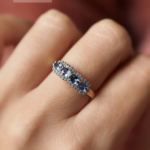 Vintage 9 carat solid gold ring with four oval cut tanzanites, surrounded by diamonds. Hallmarked in London, ca 1980’s.