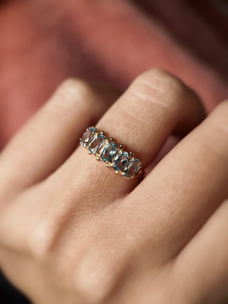 Vintage 9 karaat massief gouden row ring met lichtblauwe topaas