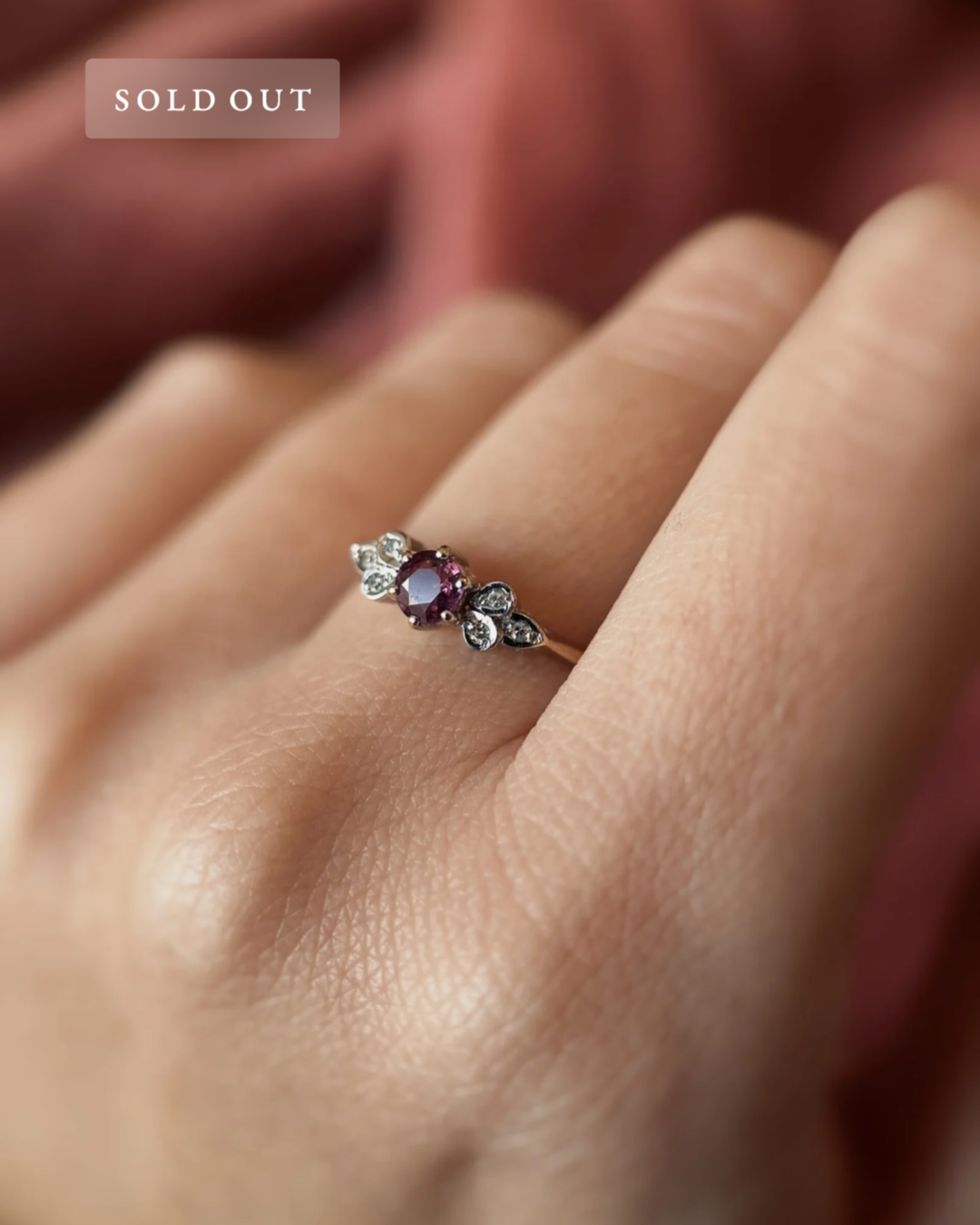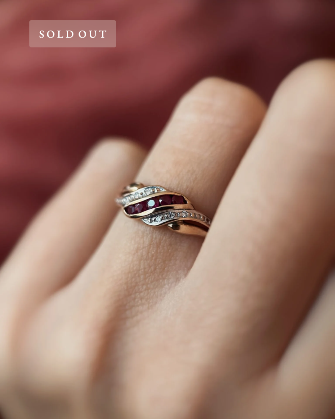 Vintage 9 carat solid gold threestone ring with one oval cut ruby two diamonds. Hallmarked in London in 1970.