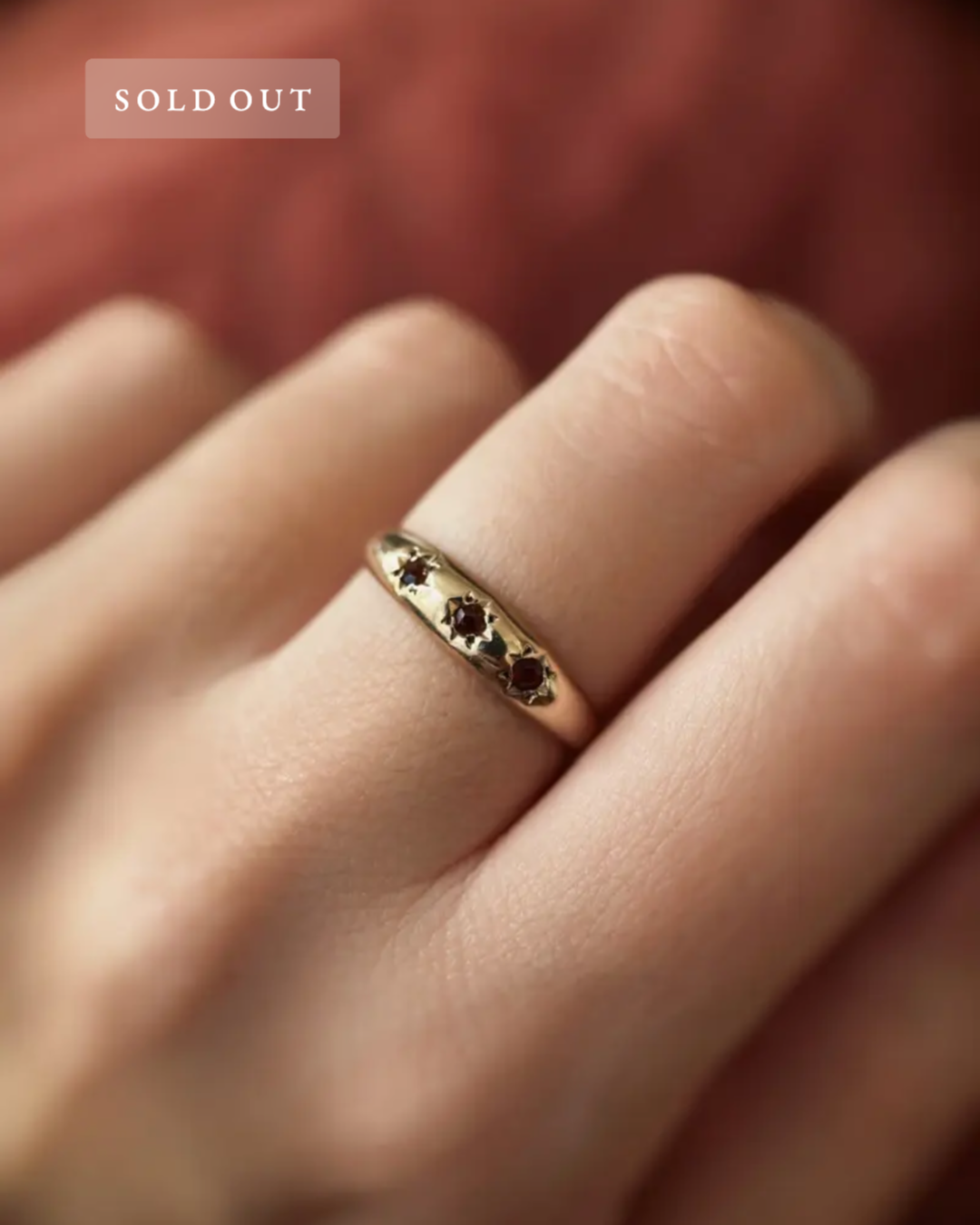 Vintage 9 carat solid gold ring with three round cut garnets in starburst setting. Hallmarked in Sheffield.