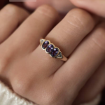 Vintage 9 carat solid gold threestone ring with one oval cut amethyst and two 0,01 ct diamonds in white gold. Hallmarked in London.