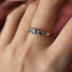 Vintage 9 carat solid gold ring with 21 flat cut 0.25 ct diamonds as centre stones and 6 diamonds on the shoulders. Hallmarked in Birmingham.