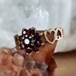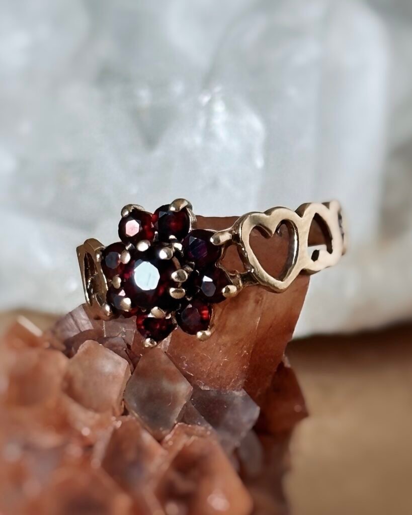 Vintage 9 carat solid gold cluster ring with garnets in the shape of a flower. The ring band is made of connected hearts. Hallmarked in Birmingham in 1978.