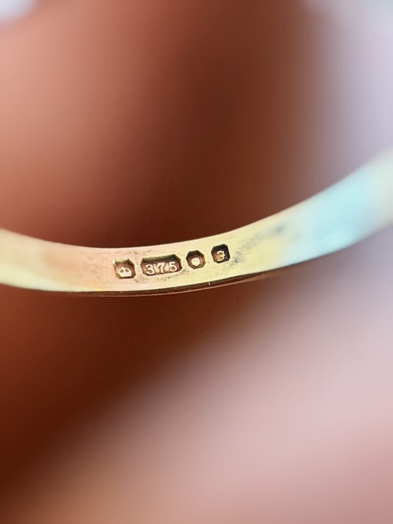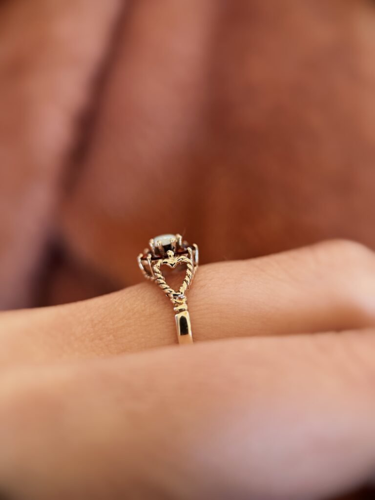 Made from solid 9k gold and marked with the London leopard hallmark and a date letter for 1980, this vintage gold ring reflects its original period. The openwork details along the band add a delicate and decorative element, making this a distinctive opal and garnet ring that can be worn on its own.