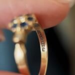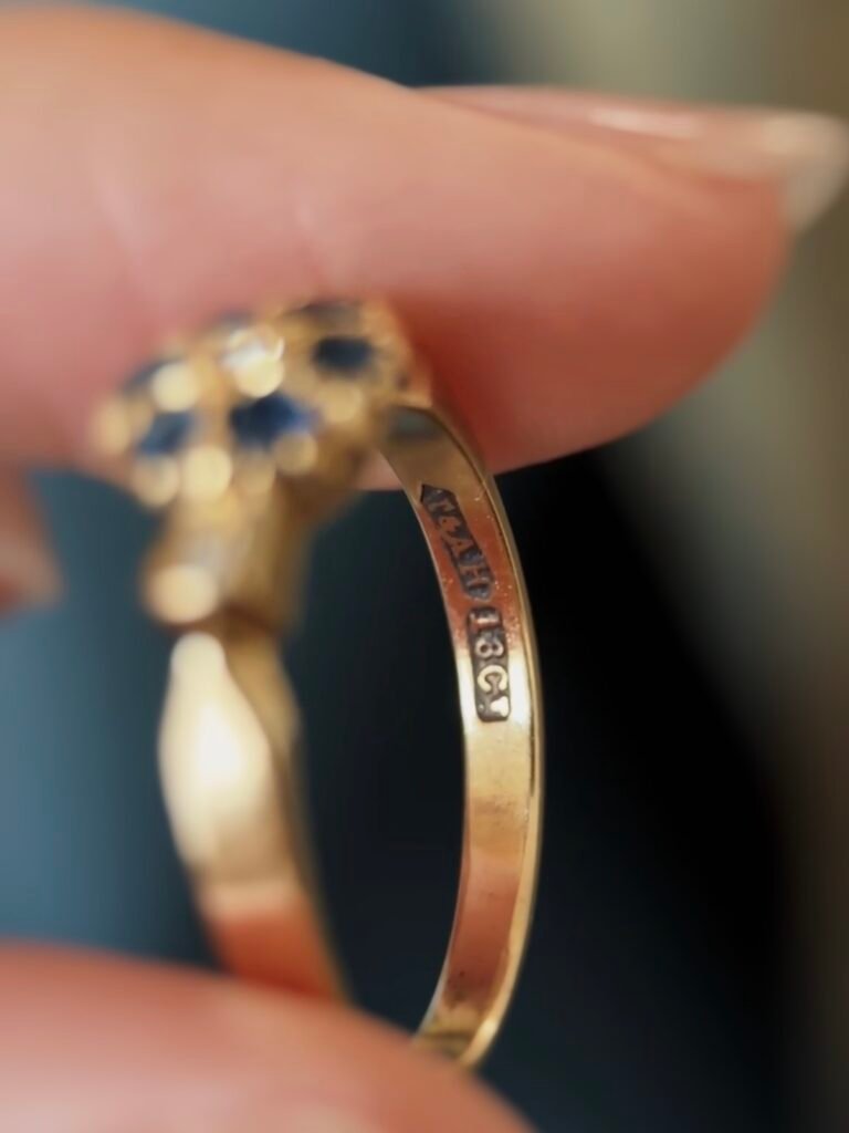 Antique late victorian 18 carat solid gold cluster ring with a six sapphires, a diamond in the center and two diamonds on the shoulders. Marked for 18 carat gold, stamped with a date letter for 1893.