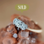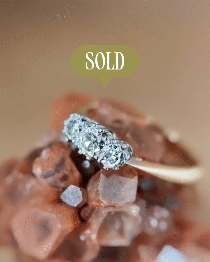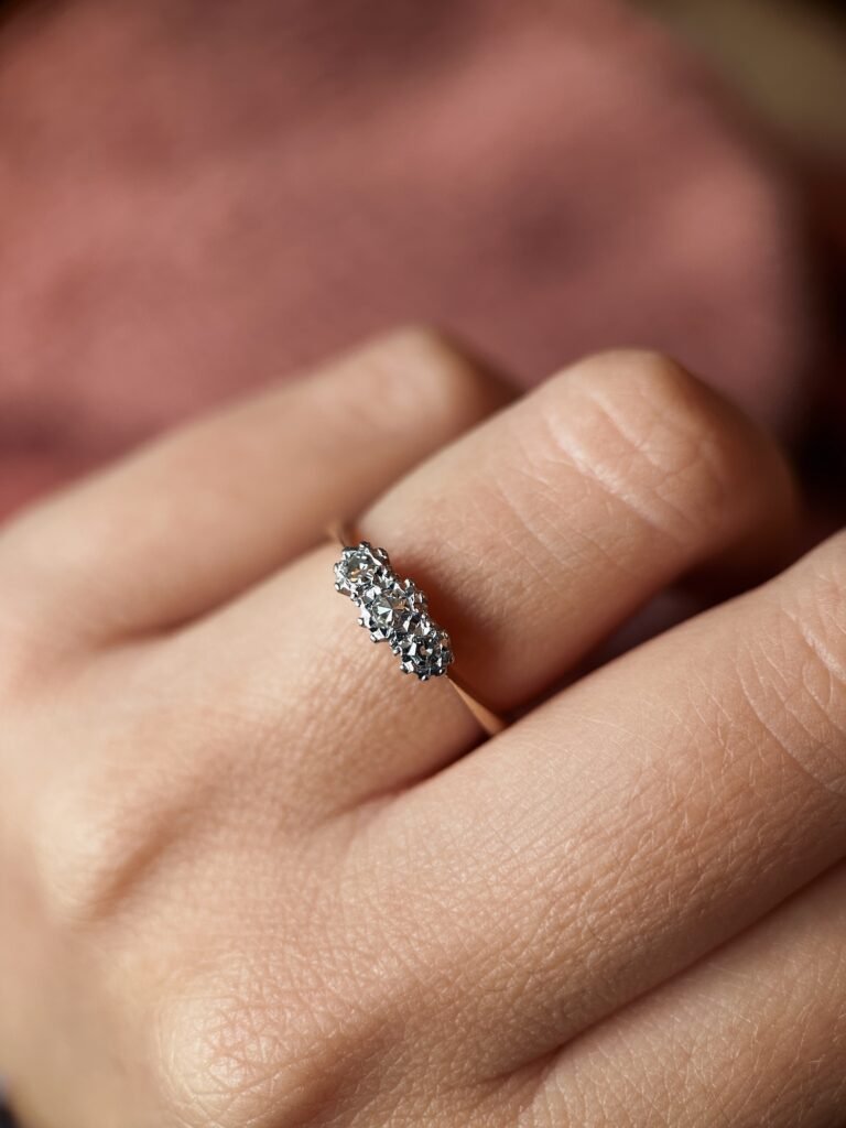 Antieke 9 karaat massief gouden threestone ring met handgeslepen diamanten uit 1900 Om hand