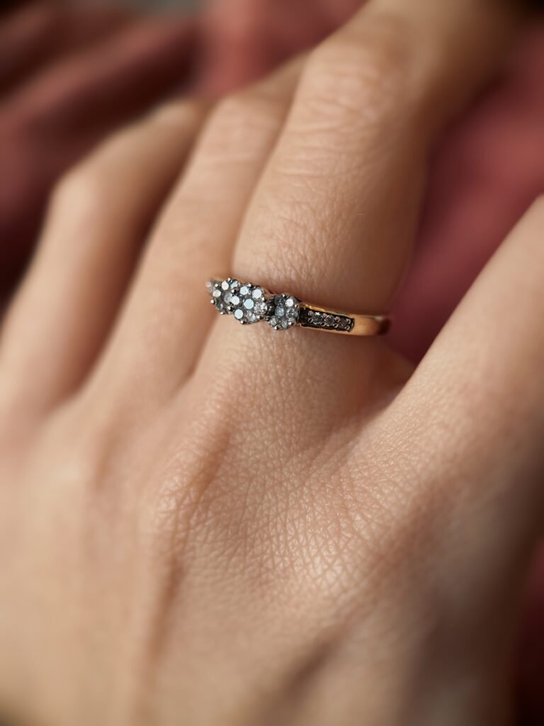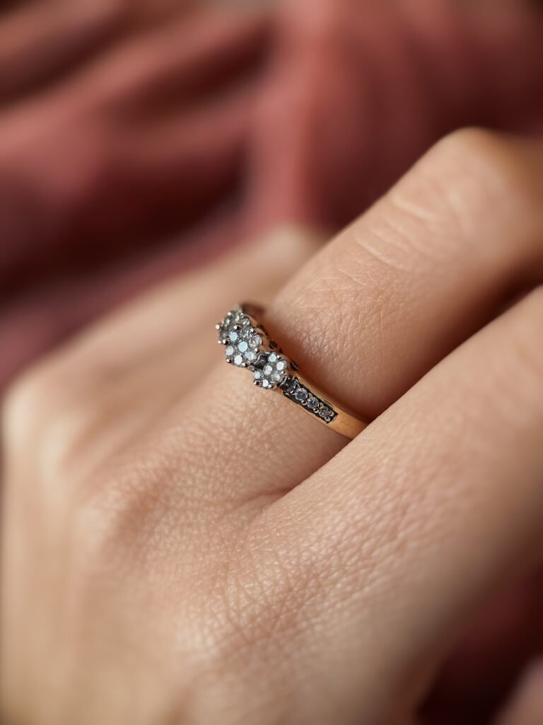 Vintage 9 carat solid gold ring with 21 flat cut 0.25 ct diamonds as centre stones and 6 diamonds on the shoulders. Hallmarked in Birmingham.