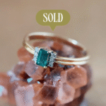 Vintage 9 carat solid gold ring with a 5×3 mm emerald cut emerald and six round cut diamonds. Hallmarked in Sheffield.
