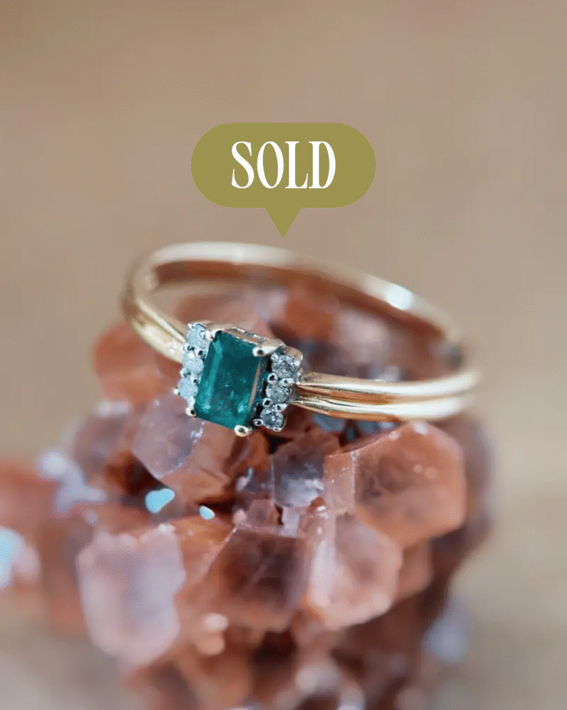 Vintage 9 karaat massief gouden ring met emerald cut smaragd en zes diamantjes