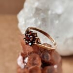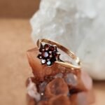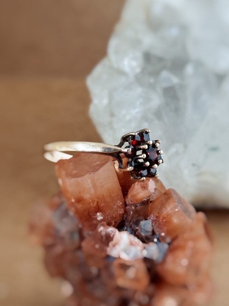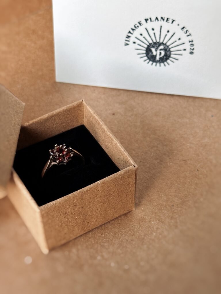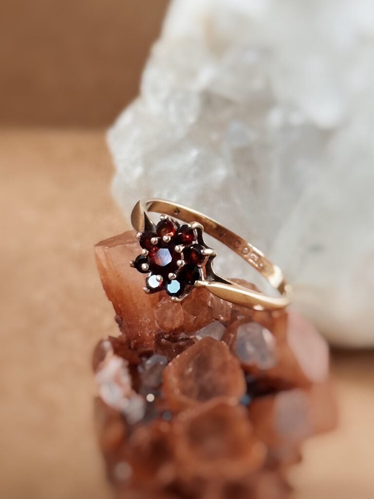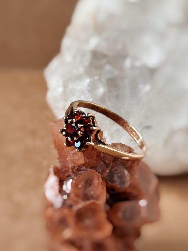 Vintage 9 carat solid gold ring, the face of the ring measures 8 mm across and is set with garnets. Assayed in Birmingham, made in 1970.