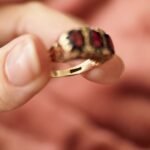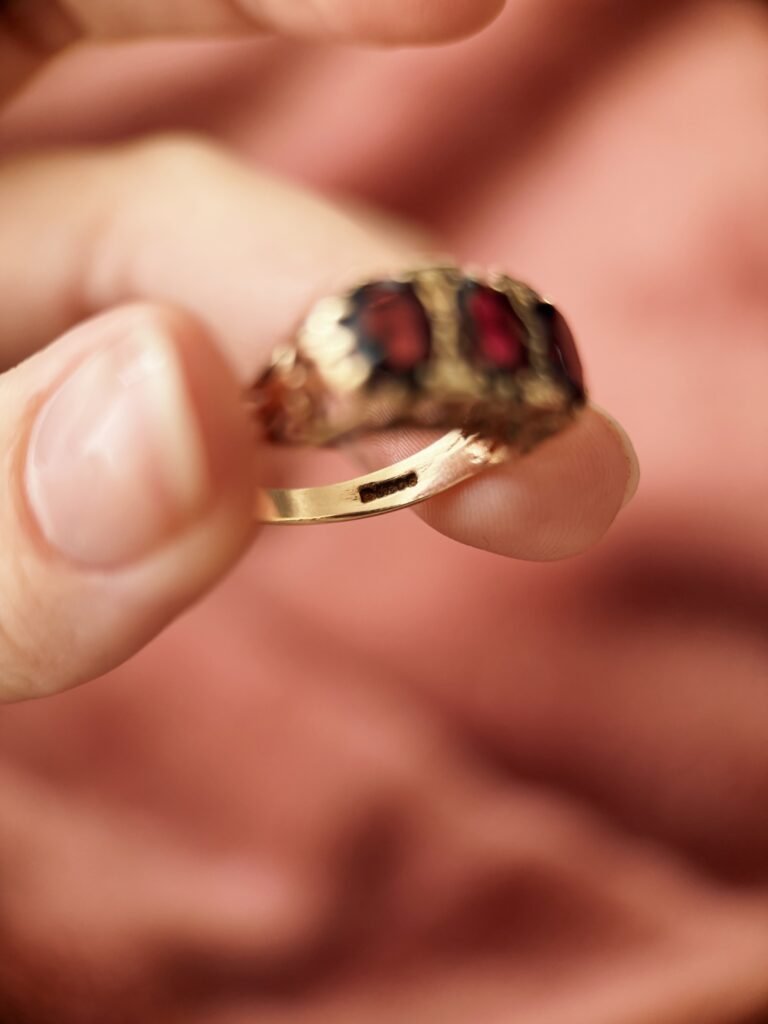 Vintage 9 carat solid gold threestone ring with three big oval cut garnets. Marked for 9ct gold, stamped with the London leopard hallmark and a date letter for 1977.