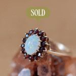 Vintage 9 carat solid gold cluster ring with a cabochon cut opal surrounded by round cut garnets. Hallmarked for 9ct gold.