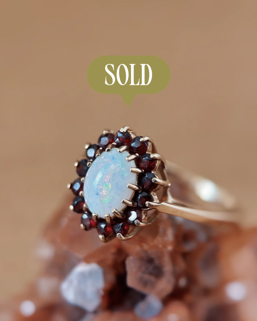 Vintage 9 karaat massief gouden custer ring met witte opaal en granaatjes Om hand