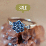 Vintage 9 carat solid gold ring with seven round cut tanzanites in flower shape, and two diamonds on the shoulders. Hallmarked in London.